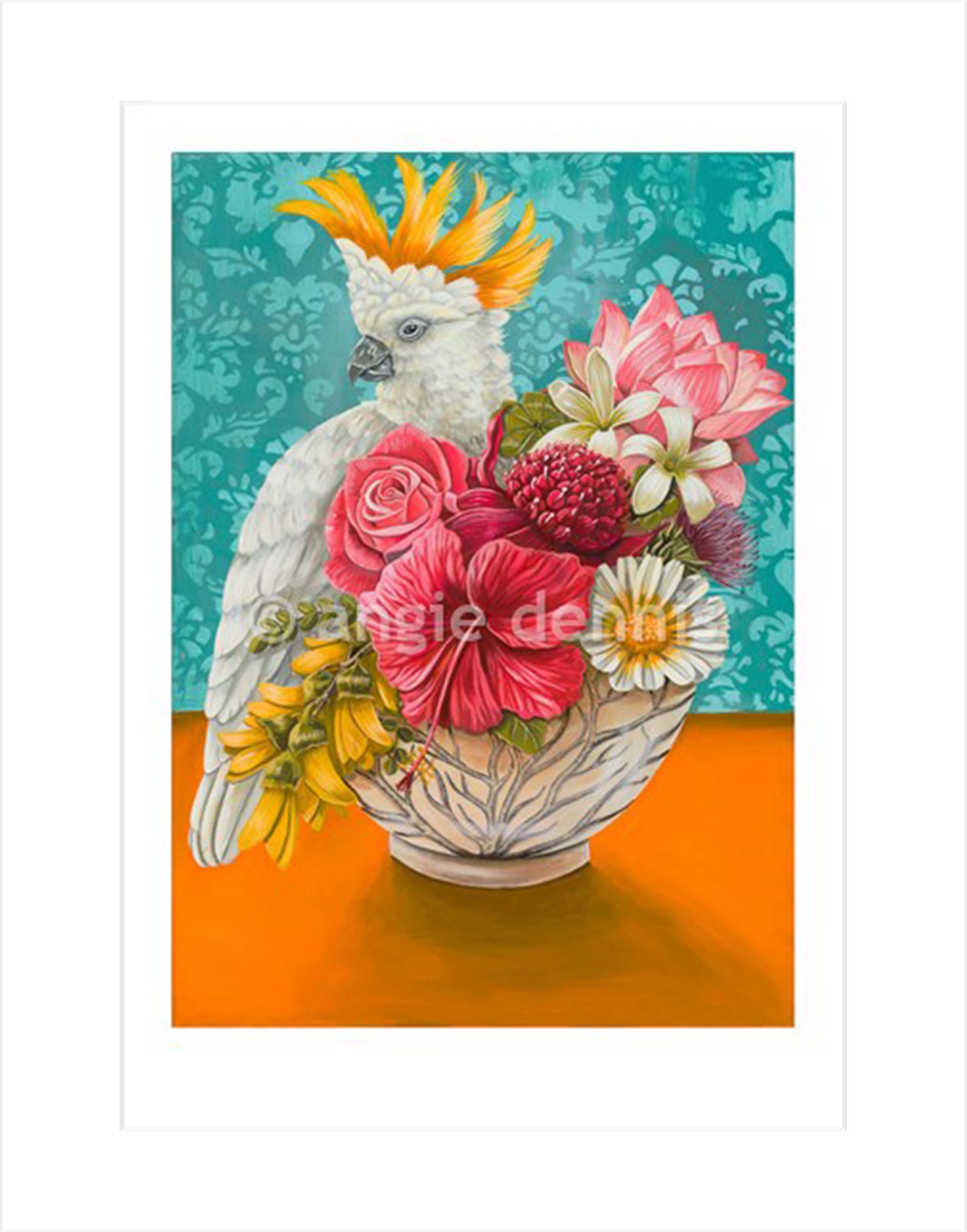 My family and friends are my foundation and I love the laughter and chatter when we all get together. They either live or come from all parts of the world. I’ve used different flowers to represent their nationalities, the roots to represent our history and the Sulphur-Crested Cockatoo is the most talkative of birds, need I say more! Kowhai (NZ), Waratah (Australia/NSW), Hibiscus (Pacific Island), Marguerite Daisy (Denmark), Shamrock Flower/clover (Ireland), Thistle (Scotland), Lotus (Vietnam).