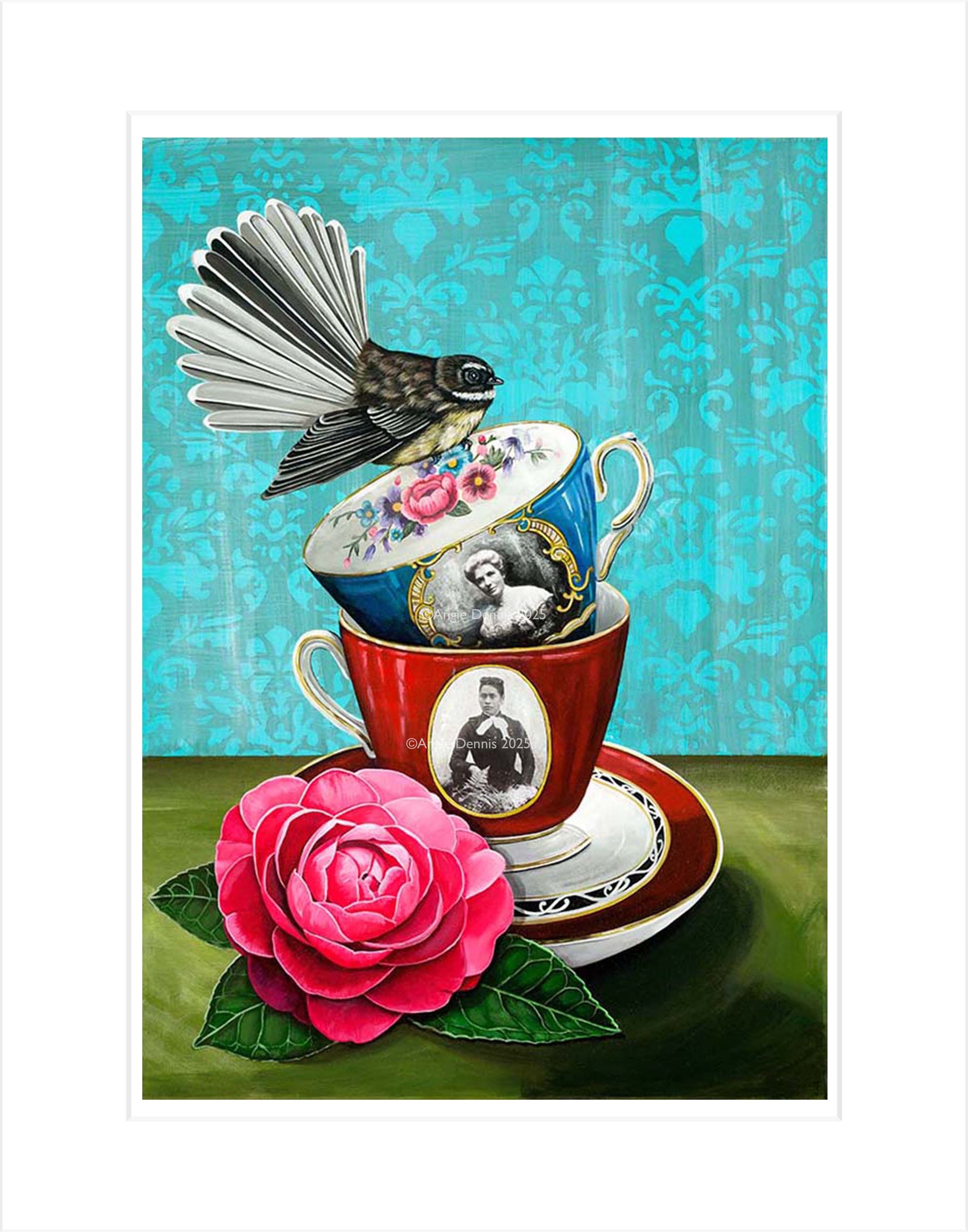 Inspired by the suffragette movement of the 19th century. In 1893 New Zealand became the first country in the world to allow women to vote. Kate Sheppard and Meri Mangakahia, were both New Zealand suffragettes. The camellia flower also appears on the 10 dollar note next to Kate Shepherd and were given to members of parliament who supported the suffrage bill (the flower is however white on the ten dollar note). Deeds not words was a famous saying of the UK suffragette Emmeline Pankhurst.