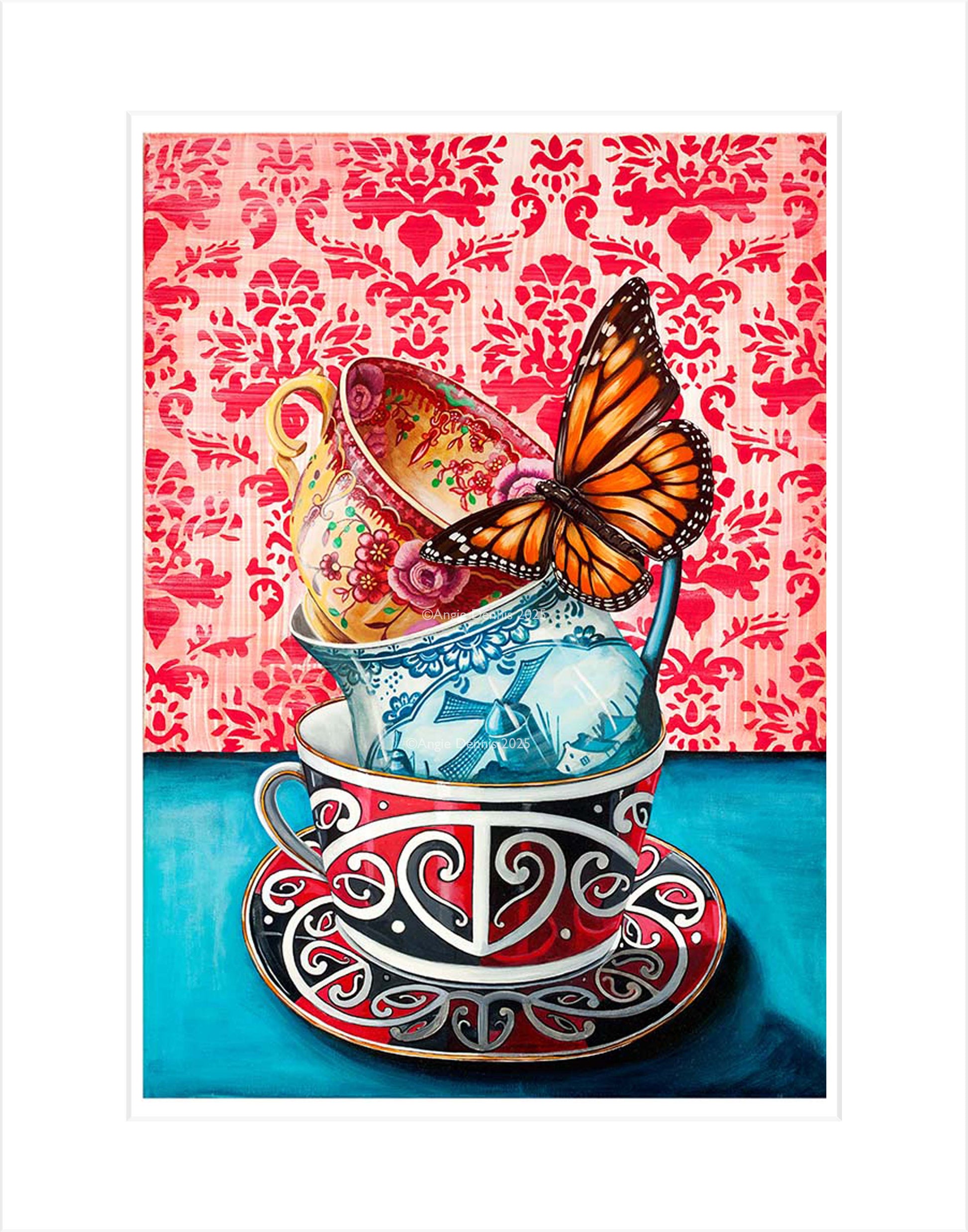 Māori cup - inspired by the “Māori ware” manufactured by Royal Doulton (1906 to 1923). Māori people were the first settlers to New Zealand, thought to be around the 13th century. The blue and white cup I designed myself to represent the Dutch explorer Abel Tasman, the first European to discover New Zealand in 1642. Yellow/pink cup - signifies the British explorer James Cook, the first European to outline the coast of New Zealand (late 18th century) and may also be the cup he drank from on his voyages. Butterflies can symbolise hope, new beginnings and happiness