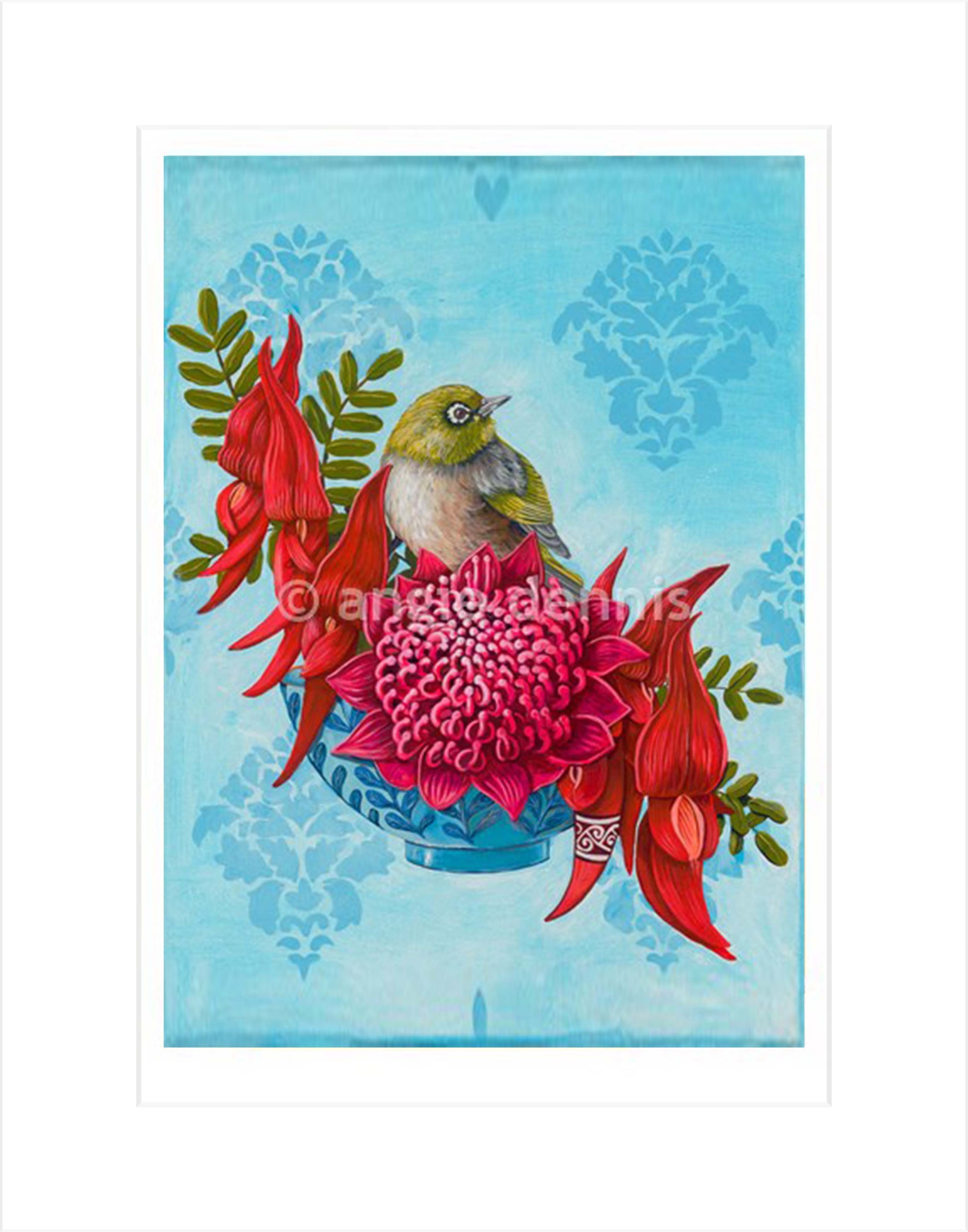 Diversity Without diversity, the natural environment wouldn’t survive. New Zealand could be considered as one of the most diverse nations in the world due the high rates of immigration. These 4 pieces celebrate and recognise New Zealand’s cultural diversity together with the unique native birds. There are over 200 nationalities in NZ so I was only able to cover a few countries in these pieces. The bowl is the same in each piece to show the commonality of each nationality based on where we live. Wax Eye/Silver Eye, Waratah (Aus), Kaka Beak (NZ).