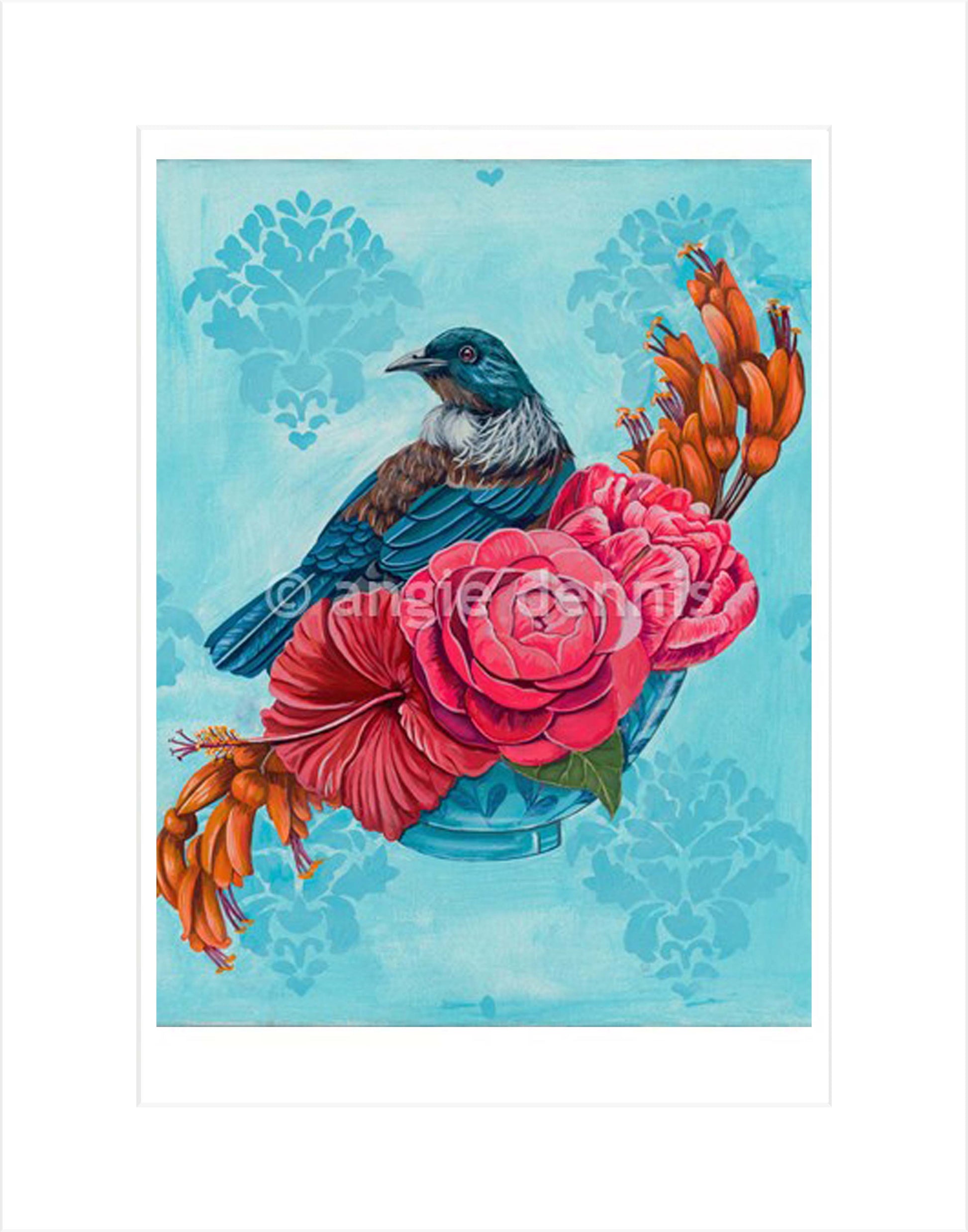 Diversity Without diversity, the natural environment wouldn’t survive. New Zealand could be considered as one of the most diverse nations in the world due the high rates of immigration. These 4 pieces celebrate and recognise New Zealand’s cultural diversity together with the unique native birds. There are over 200 nationalities in NZ so I was only able to cover a few countries in these pieces. The bowl is the same in each piece to show the commonality of each nationality based on where we live. Tui, Hibiscus (Pacific Islands), Harekeke (NZ), Tullip (Netherlands), Camellia – New Zealand was one of the first countries who allowed women the vote and was worn by the NZ suffragette Kate Sheppard, in this painting it represents equality.