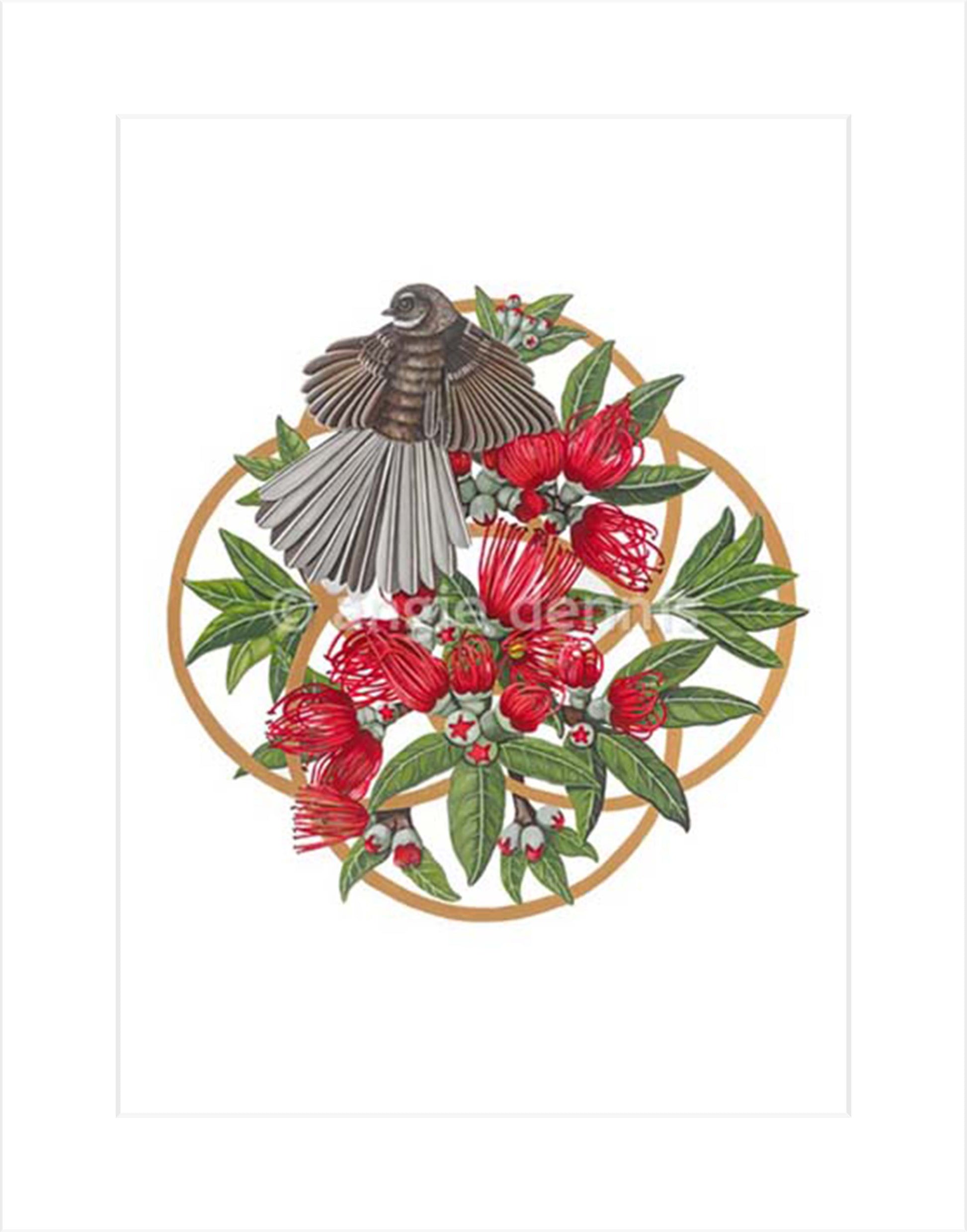 I don’t think you can beat the pleasure of watching the territorial dance of a Fantail as you walk by, it always puts a smile on my face. The four circles represent the fine balance of nature.