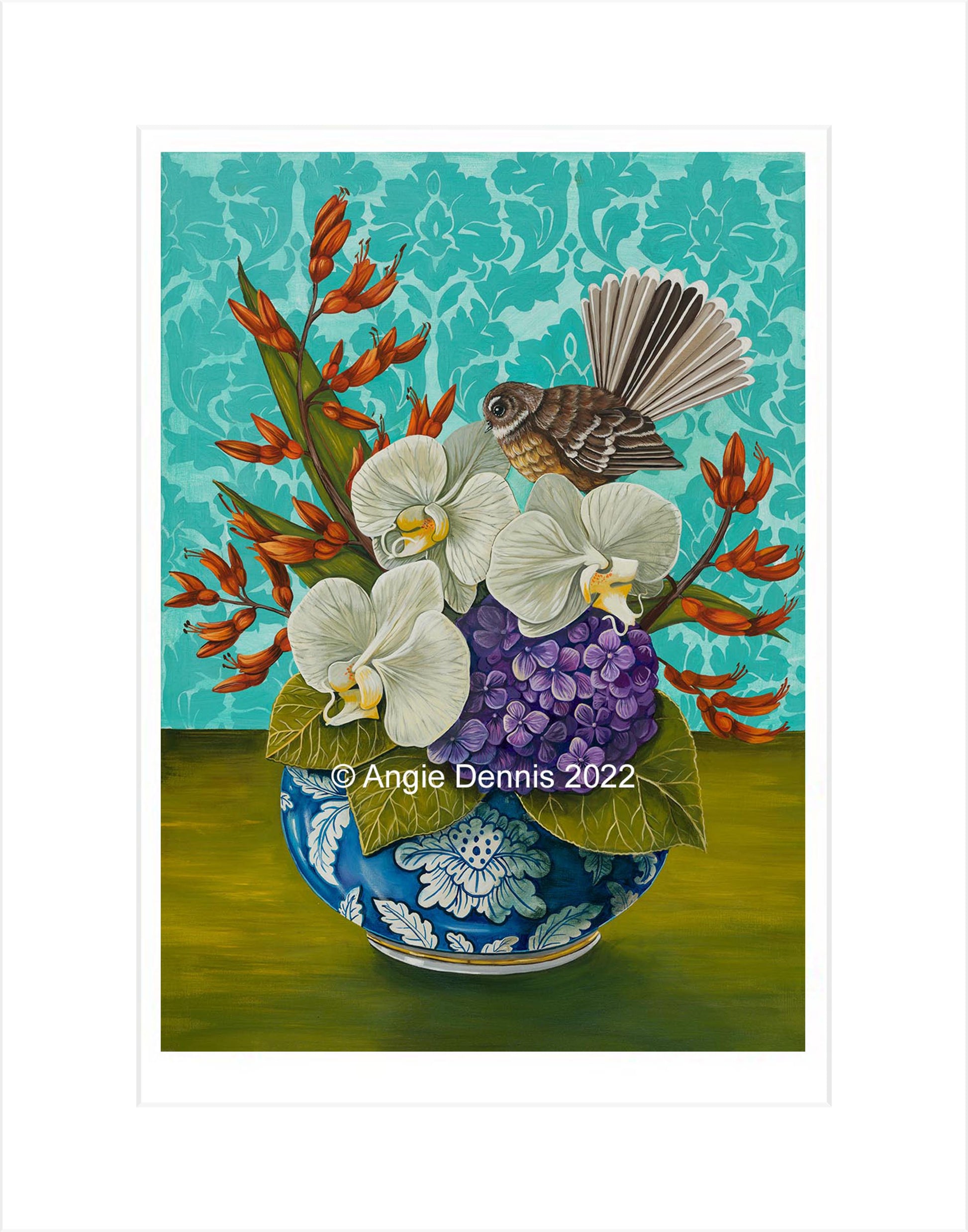 This piece celebrates the things we cherish, and looking after them. The painting includes elements I’ve created from originals I’ve used before : the fantail, the blue bowl (from Fine Balance) and the flax flower from my earlier works. It reminds me how we can nurture and cherish what we have and yet still create something new and inspiring!