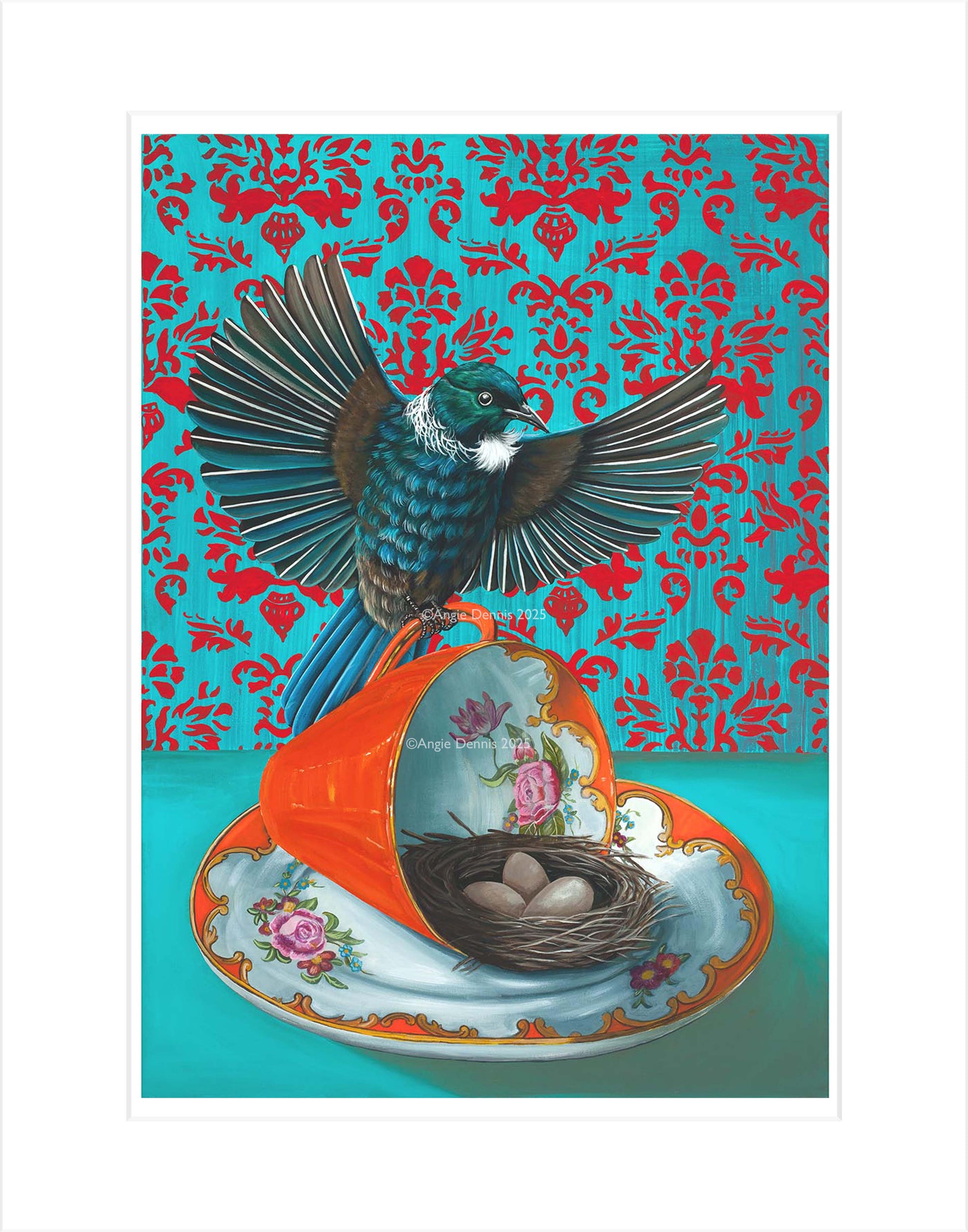 In Nurture the fantail is sitting closely over the eggs, watching carefully. Nature the Tui is in flight, the cup’s knocked over, things are a little more free style!