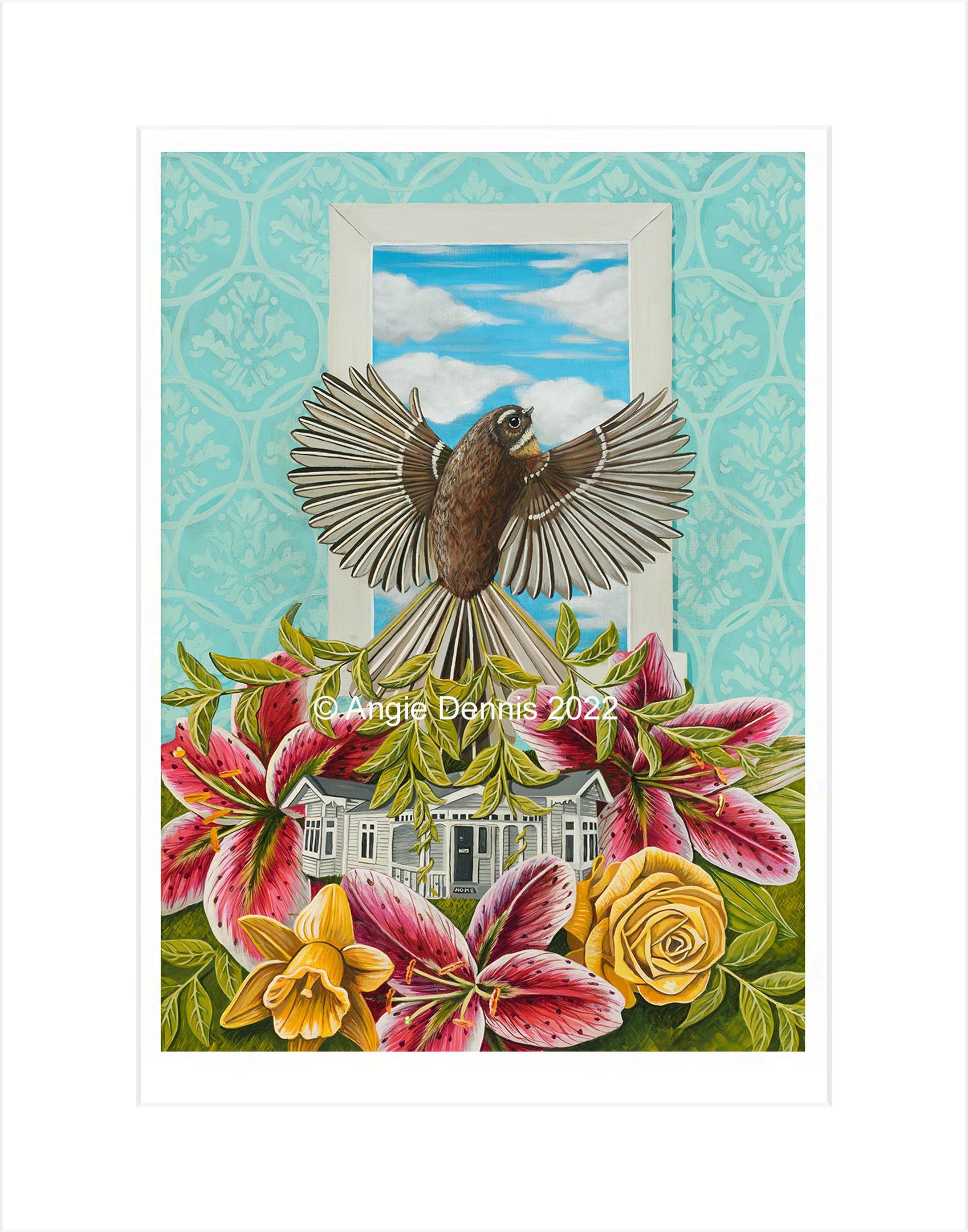 I’m an avid listener of podcasts when I’m creating! I came across this saying listening to a show about raising your children. As I watch my teenagers become more and more independent each day the saying resonated so much with me. You provide your children roots to grow and wings to fly. The fantail is flying out of the window but remains tied to its home, the roots through the foliage, the Lilies represent love and compassion.