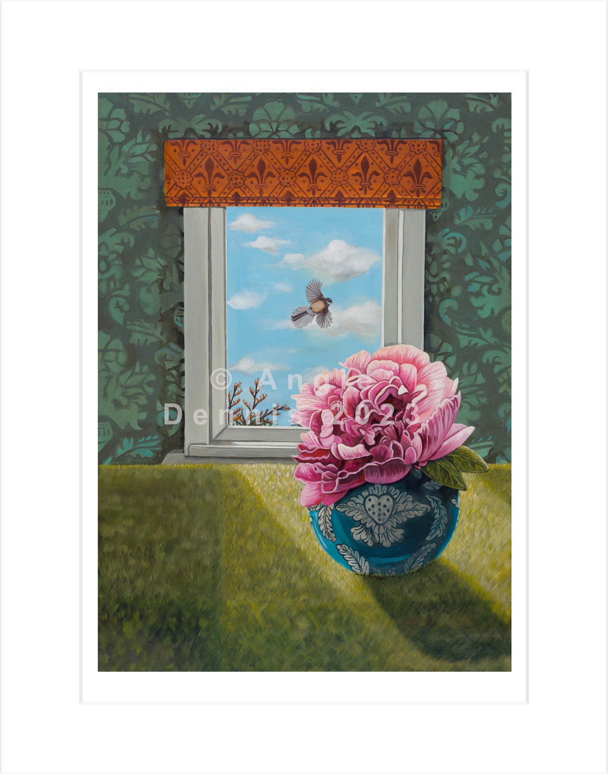 Each piece I created in 2023 has a window and a bird flying out of it possibly representing new adventure or new beginnings. Each artwork is inspired by events, conversations or interviews I’ve seen or listened to over the last 12 months. In producing them I hope they connect with you; the viewer and you interpret each artwork in your own way and perhaps it provokes further conversation.
