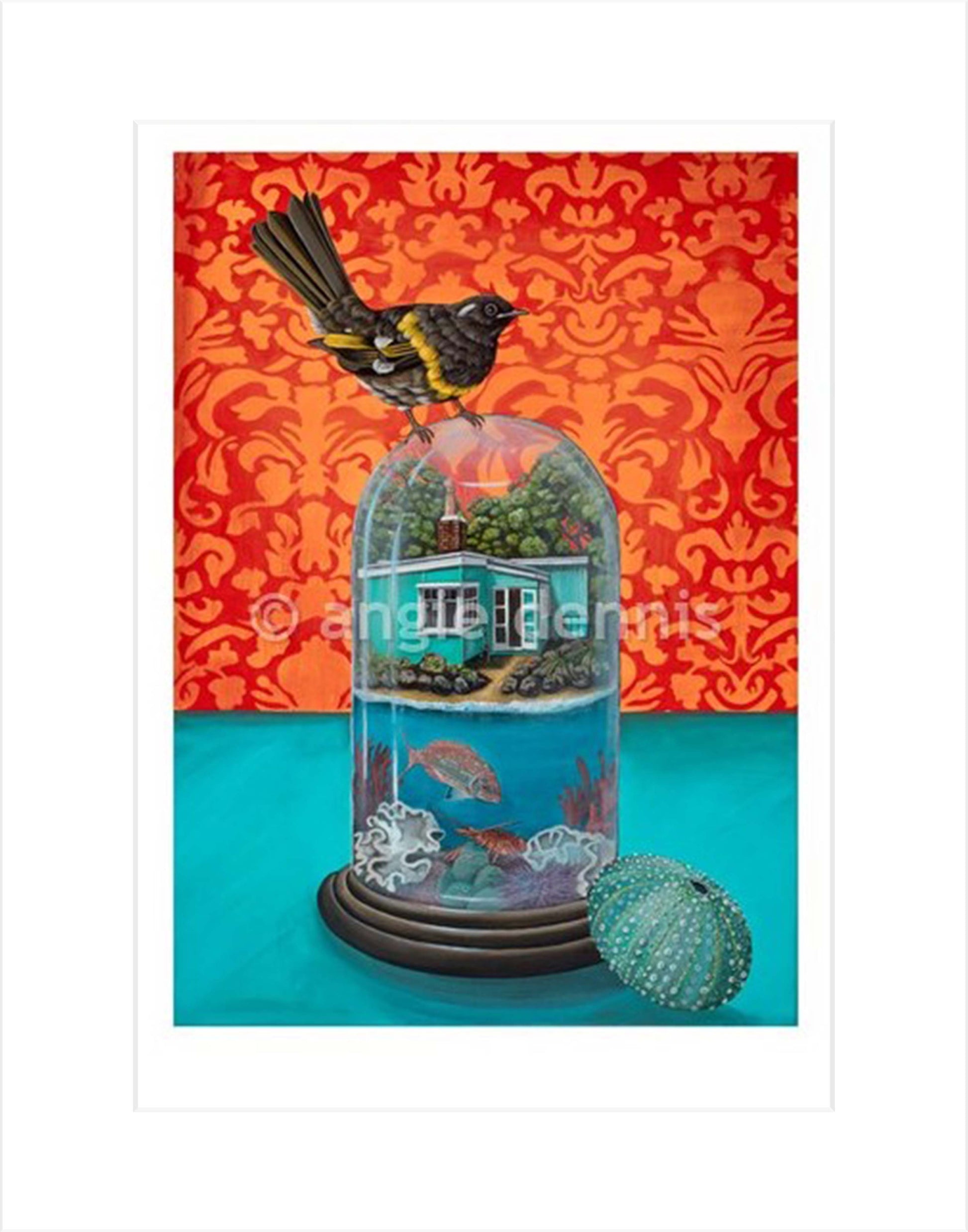 The use of glass represents how fragile and precious part of the New Zealand way of life is. The New Zealand Stitchbird is known to chirp out warning signs of impending danger, in this case the loss of some of our beautiful coastlines, the unique wildlife, or the simple bach retreat.